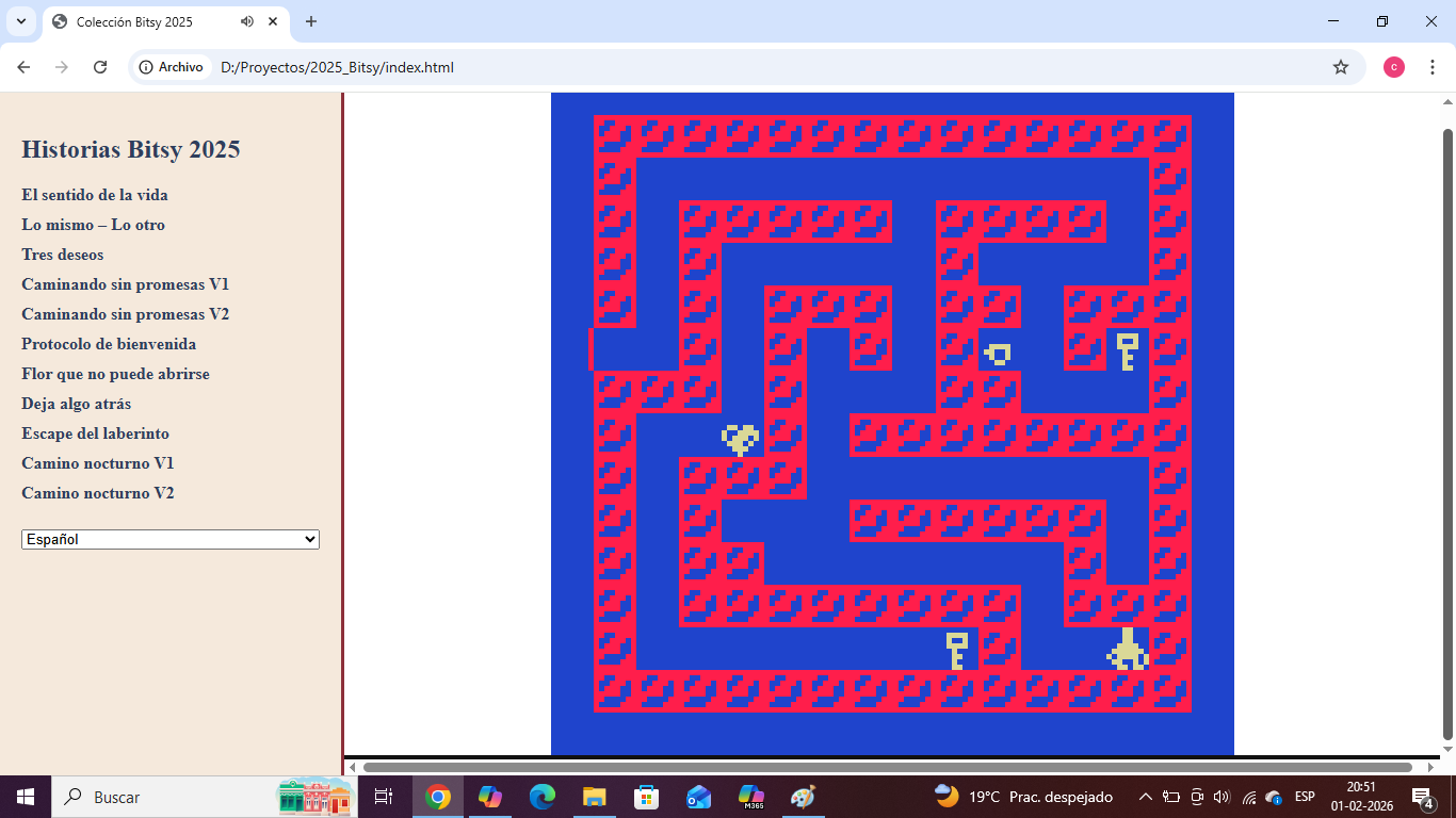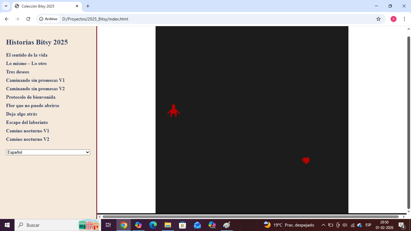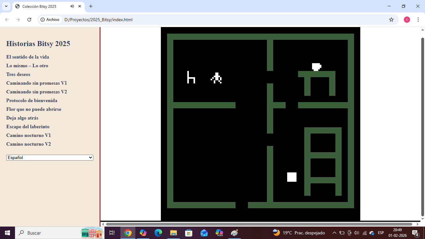 Historias mínimas, mundos infinitos reúne doce juegos creados en Bitsy durante 2025. Cada uno es una ventana pixelada hacia lo invisible: errores de sistema, caminos nocturnos, deseos incumplidos y protocolos de bienvenida. Son relatos breves, minimalistas y poéticos, que invitan a explorar lo intangible en mundos de pocos píxeles pero infinitas posibilidades.