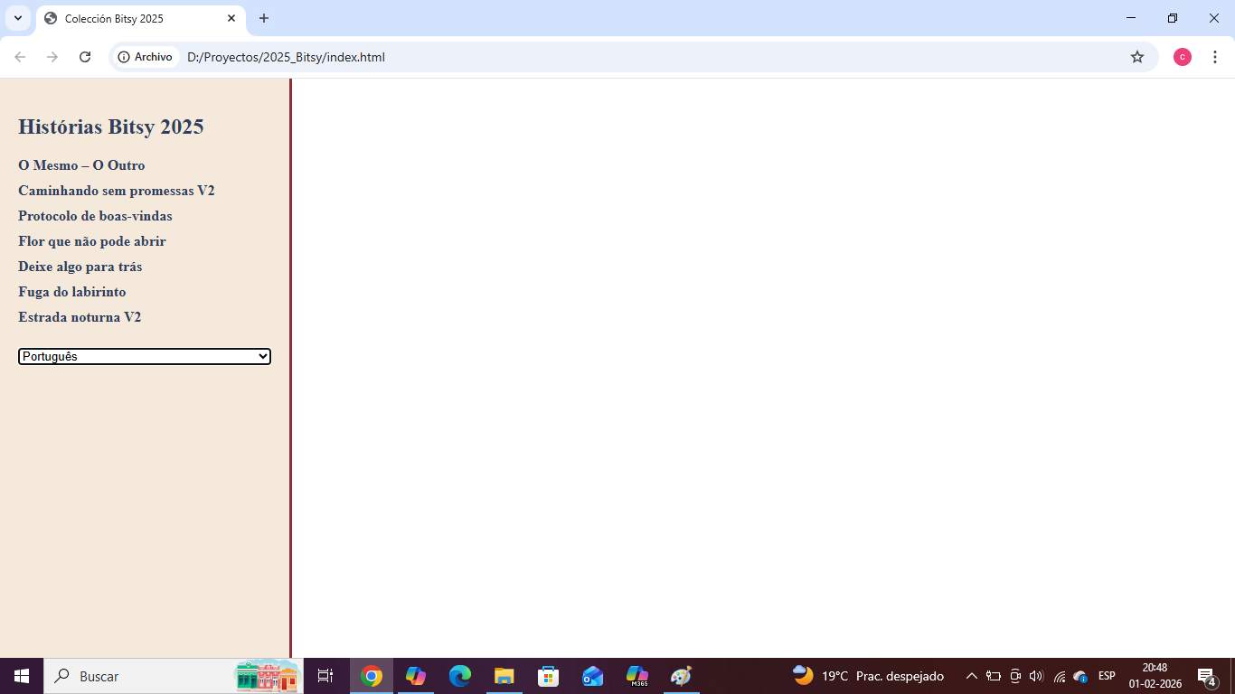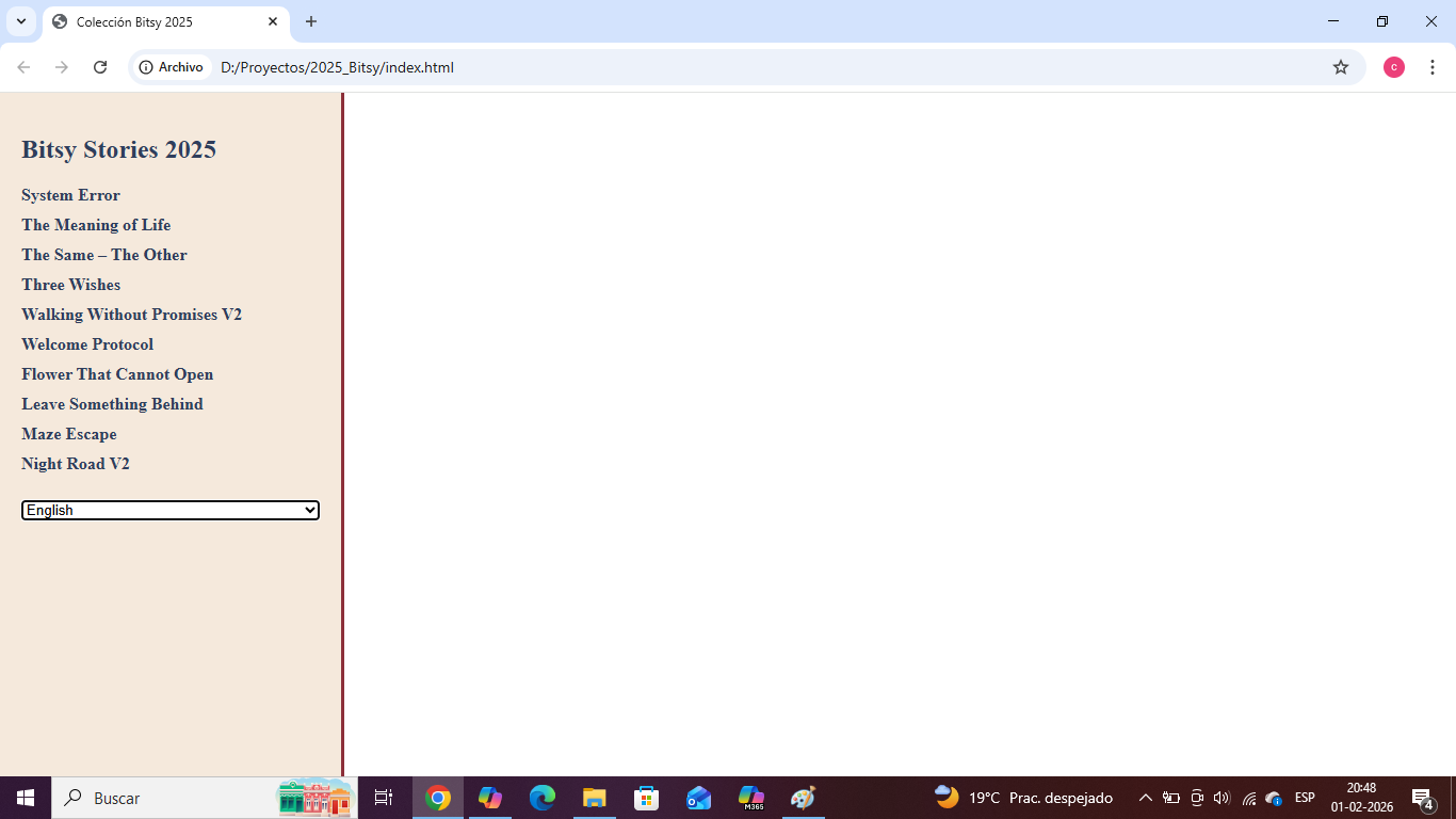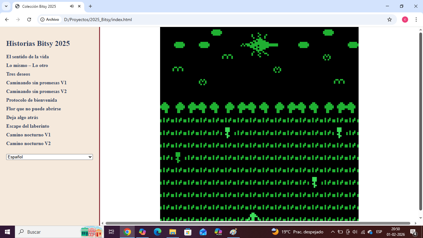 Historias mínimas, mundos infinitos reúne doce juegos creados en Bitsy durante 2025. Cada uno es una ventana pixelada hacia lo invisible: errores de sistema, caminos nocturnos, deseos incumplidos y protocolos de bienvenida. Son relatos breves, minimalistas y poéticos, que invitan a explorar lo intangible en mundos de pocos píxeles pero infinitas posibilidades.